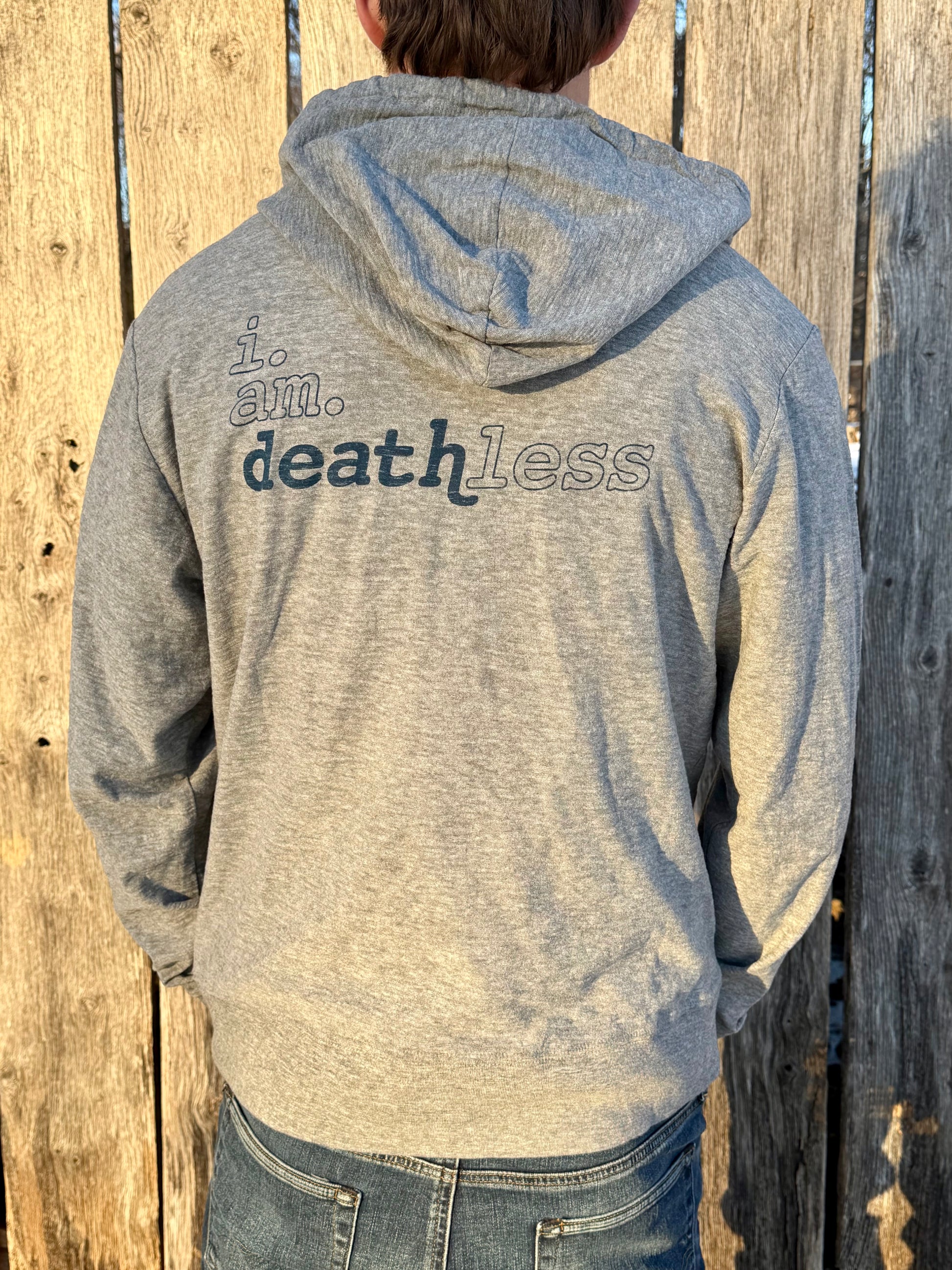The Deathless hoodie is a lightweight hoodie perfect for layering over a tee. Our hoodie features the custom Deathless cross on the front with the i.am.deathless tagline on the back. You'll wear this through all 4 seasons.